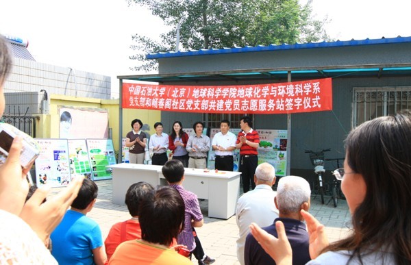 2012年5月18日上午10時30分,石大地學院地球化學與環境科學系黨支部與昌平區暢春閣社區黨支部在暢春閣社區物業門前,舉行了雙方共建黨員志愿服務站的簽字儀式,石大地學院分黨委書記劉洛夫、暢春閣社區黨支部書記趙春利分別代表雙方在協議上簽字。石大地學院分黨委副書記陳冬霞、地球化學與環境科學系系主任張枝換、黨支部書記尹秀英和部分教師與學生、暢春閣社區黨支部副書記楊濤、居委會主任趙彩云、物業主任陳慶菊等出席了簽字儀式。