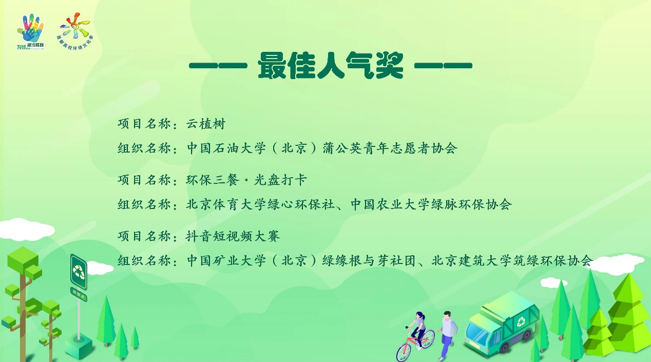 12月19日,第十七屆首都高校環(huán)境文化季在北京市生態(tài)環(huán)境保護(hù)宣傳中心完美落幕。在本屆環(huán)境文化季中,中國(guó)石油大學(xué)(北京)蒲公英青年志愿者協(xié)會(huì)舉辦的“云植樹”活動(dòng)在12項(xiàng)環(huán)保實(shí)踐活動(dòng)中脫穎而出,榮獲“最佳人氣獎(jiǎng)”。蒲公英青年志愿者協(xié)會(huì)成員胡深宇、岳文婧在50多所高校及環(huán)保社團(tuán)的近萬名參與者中榮獲“首都高校環(huán)保衛(wèi)士”稱號(hào),該獎(jiǎng)項(xiàng)獲得者僅有30人。