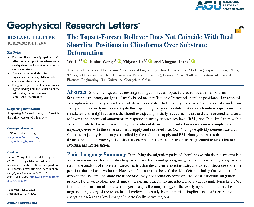 近日,我院2021級博士生李威在王俊輝副教授與葛智淵教授指導(dǎo)下,聯(lián)合吉林大學(xué)黃興國教授合作完成的論文《The Topset‐Foreset Rollover Does Not Coincide With Real Shoreline Positions in Clinoforms Over Substrate Deformation》發(fā)表在自然指數(shù)期刊《Geophysical Research Letters》。李威為論文第一作者,王俊輝和黃興國為通訊作者,中國石油大學(xué)(北京)油氣資源與工程全國重點(diǎn)實(shí)驗(yàn)室和地球科學(xué)學(xué)院為第一完成單位。