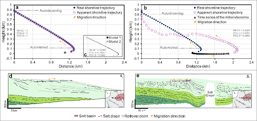 本研究基于海岸線自動(dòng)后退原理、鹽構(gòu)造變形機(jī)制,通過開展地球動(dòng)力學(xué)數(shù)值模擬,研究了基準(zhǔn)面上升過程中粘性基底對海岸線軌跡的影響,并揭示了相關(guān)的重力變形機(jī)制。研究結(jié)果表明,當(dāng)存在粘性基底時(shí),沉積物僅通過重力拓展作用就能夠驅(qū)動(dòng)基底變形并改變沉積后的海岸線位置(頂積層和前積層的坡折點(diǎn)),從而掩蓋真實(shí)的海岸線軌跡。復(fù)雜的變形過程不僅導(dǎo)致坡折點(diǎn)紀(jì)錄的海岸線軌跡不真實(shí),還難以基于現(xiàn)今軌跡準(zhǔn)確重建真實(shí)的海岸線變化。本研究指出,沉積系統(tǒng)演化和同沉積變形對海岸線軌跡的幾何形態(tài)具有根本性的控制作用。厘清識別的海岸線軌跡和真實(shí)軌跡之間的差異對地層學(xué)分析和海平面重建具有重要意義,尤其在構(gòu)造活躍的區(qū)域。