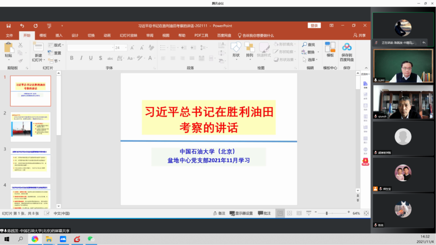 第一階段,李美俊介紹了11月份學(xué)習(xí)要點(diǎn),學(xué)習(xí)共分為三部分:首先,陳踐發(fā)同志結(jié)合自己多年與勝利油田科研合作的經(jīng)歷,深入淺出地領(lǐng)學(xué)了“習(xí)近平總書記在勝利油田考察的講話”,認(rèn)為習(xí)近平總書記察勝利油田并發(fā)表重要講話,釋放了幾個(gè)重要信號(hào):①雙碳背景與能源行業(yè)發(fā)展不矛盾,即使到2060年實(shí)現(xiàn)碳中和,中國每年仍要3~4億噸的石油消耗,從現(xiàn)在至2060年碳中和,油氣行業(yè)仍有40多年的發(fā)展,石油人仍大有可為;②雙碳背景下能源行業(yè)要加強(qiáng)創(chuàng)新的意識(shí),提高產(chǎn)品附加值,減少碳排放;③能源的飯碗必須牢牢端在自己的手里,要逐漸改變當(dāng)前原油和天然氣大規(guī)模依賴進(jìn)口的局面;④作為石油行業(yè)高校教師,要給學(xué)生正面的引導(dǎo),從國家發(fā)展需求和行業(yè)發(fā)展規(guī)律方面分析“雙碳”與石油行業(yè)發(fā)展之間的邏輯關(guān)系。隨后,龐雄奇、曾濺輝、邱楠生和李美俊幾位同志談到了與勝利油田的科研合作,認(rèn)為勝利油田在技術(shù)創(chuàng)新和基礎(chǔ)科研方面的取得了很大成功。“碳達(dá)峰”和“碳中和”是個(gè)長期的過程,在這個(gè)過程中要正視石油行業(yè)發(fā)展規(guī)律,石油行業(yè)將從“化石能源”為主的功能向“技術(shù)創(chuàng)新和生產(chǎn)高附加值的化工產(chǎn)品”的功能轉(zhuǎn)換。張同鋼同志就《中共中央國務(wù)院關(guān)于完整準(zhǔn)確全面貫徹新發(fā)展理念做好碳達(dá)峰碳中和工作的意見》進(jìn)行了解讀,他從地球環(huán)境演化專業(yè)的角度,分析了全球二氧化碳含量的變化規(guī)律、我國二氧化碳排放量等資料,對(duì)國家制訂“雙碳”目標(biāo)決策背景進(jìn)行了說明。隨后,李美俊同志領(lǐng)學(xué)了學(xué)習(xí)踐行新時(shí)代師德規(guī)范的相關(guān)內(nèi)容,倡導(dǎo)全體教職工涵養(yǎng)崇高師德,做新時(shí)代“四有”好老師。重點(diǎn)學(xué)習(xí)了中央對(duì)師德建設(shè)的要求、高校教職業(yè)行為規(guī)范和如何做新時(shí)代“四有”好老師幾個(gè)方面,高校教師應(yīng)做到“教書者學(xué)為人師,育人者行為世范”。