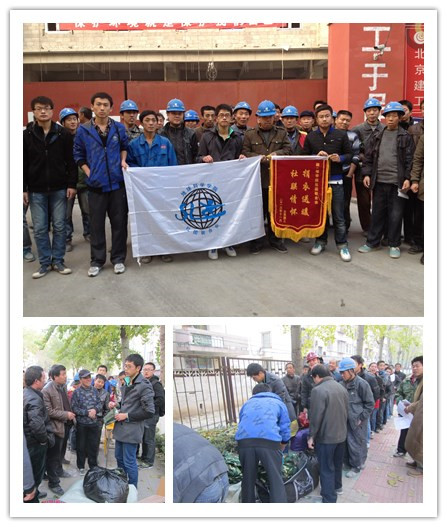 本次活動共收到全校范圍內2013級新生捐贈的軍服200余套,捐往北校區正在施工的工地,送去了來自石油大學的溫暖。軍服分發完畢,我們在工地門口舉行了簡單的錦旗授予儀式,并與農民工同志合影留念。