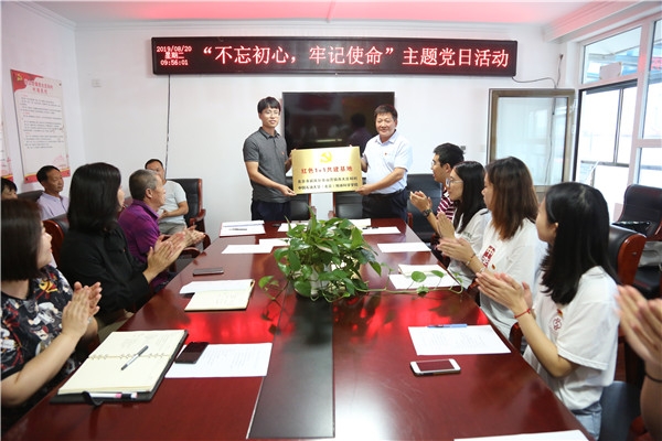 主題黨日活動中,地學院研18-1黨支部為西大莊科村黨支部授予“紅色1+1”共建基地牌匾。雙方黨員齊唱《國歌》,重溫入黨誓詞,并圍繞“不忘初心、牢記使命”主題分別發(fā)言。