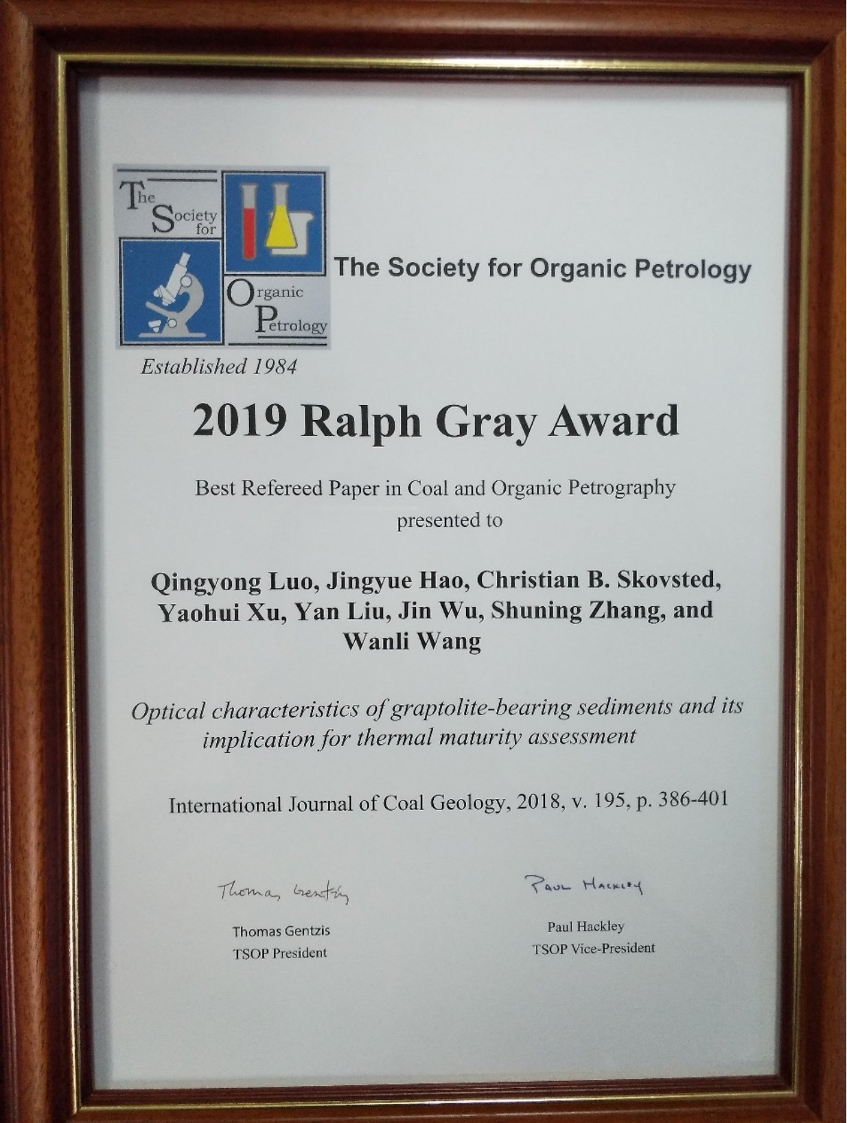 Ralph Gray獎是為紀念著名的美國煤巖學家Ralph Gray而設立的,用以表彰在煤和有機巖石學領域做出重要貢獻的科學家,該獎項每年在全世界范圍內只授予一項研究成果。羅情勇副教授因對古老海相烴源巖中筆石表皮體的有機巖石學特征的研究獲得該獎,獲獎成果為“Optical characteristics of graptolite-bearing sediments and its implication for thermal maturity assessment”(該成果2018年發表在國際能源地質領域著名期刊International Journal of Coal Geology, 195卷, 386-401頁),這也是中國大陸研究人員首次獲得該獎項。