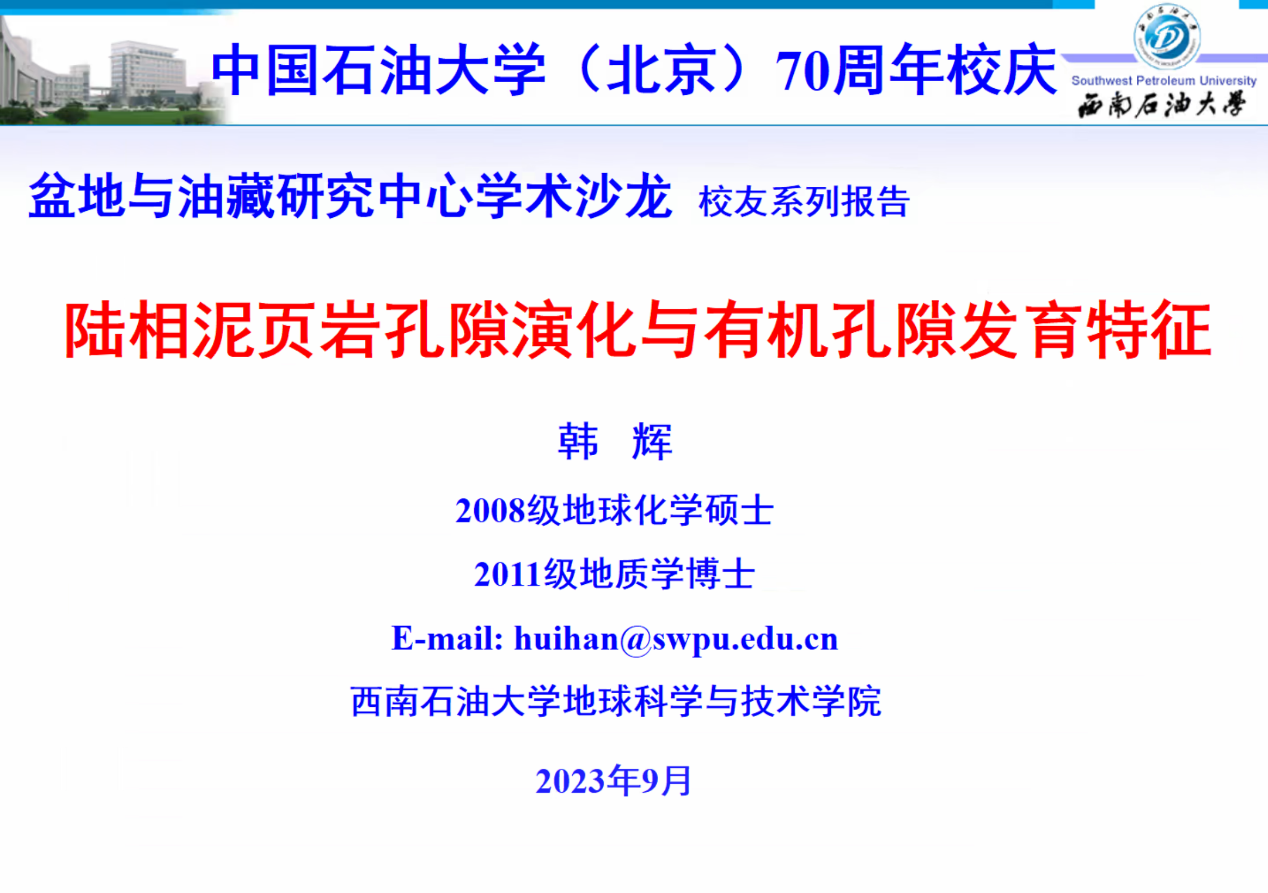 韓輝教授開展了題為“陸相泥頁巖孔隙演化與有機孔隙發育特征”的學術報告,針對頁巖有機質孔隙的非均質性和演化展開了深入研究。他從陸相頁巖孔隙的演化、有機孔隙的定量評價、有機孔隙與顯微組分的關系以及有機孔隙發育的影響等多個方面進行了學術交流,揭示了頁巖有機質孔隙形成與保存的機制,并探討了控制有機質孔隙連通性的因素。這些發現對于更好地理解頁巖儲層、優化資源開發和提高采收率具有重要的學術和應用價值。