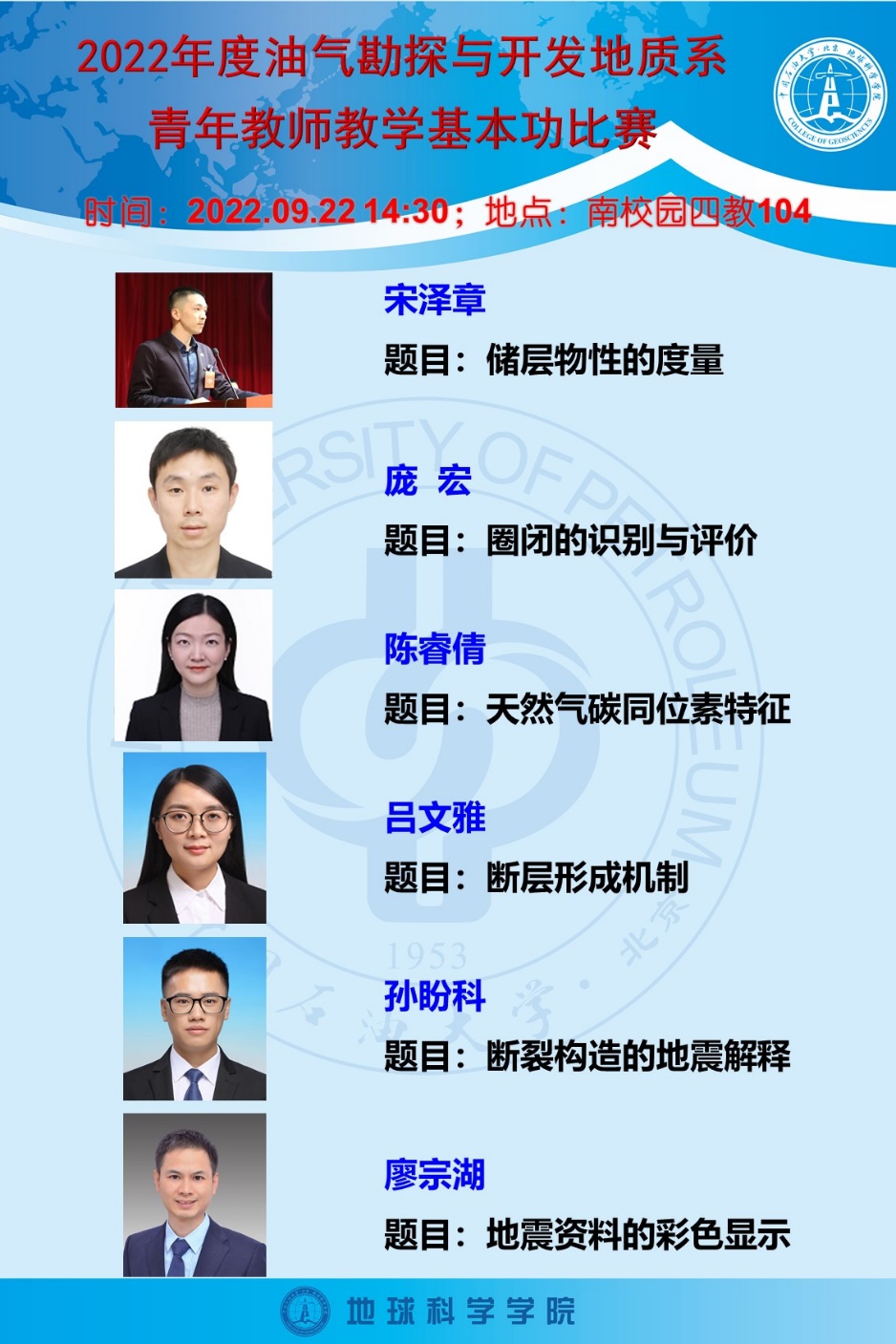 為了進一步提高青年教師業務水平,促進青年教師磨練教學內功,夯實教學基本功,提升教學質量,2022年9月22日下午,地球科學學院油氣勘探與開發地質系舉辦青年教師教學基本功比賽。由我校“北京市教學名師”柳廣弟教授、吳勝和教授、岳大力教授,“北京市青年教學名師”陳冬霞教授擔任評委,我系6位青年教師參賽。