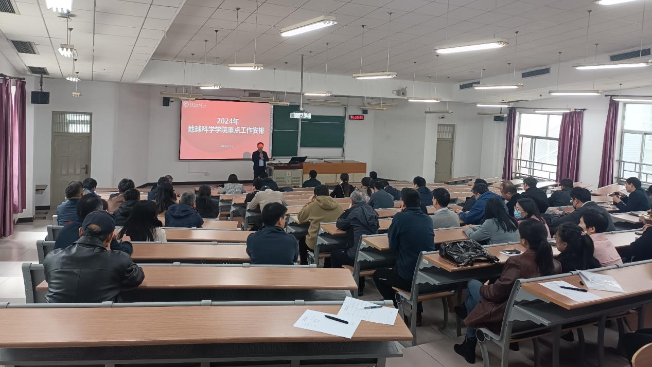 地球科學學院院長王貴文首先介紹了學校重點工作部署情況。接下來從本科教育教學、研究生教育教學、科研及人才工作、學生工作、黨建工作、工會工作、學科建設工作等幾個方面對學院2024年的工作進行了部署。