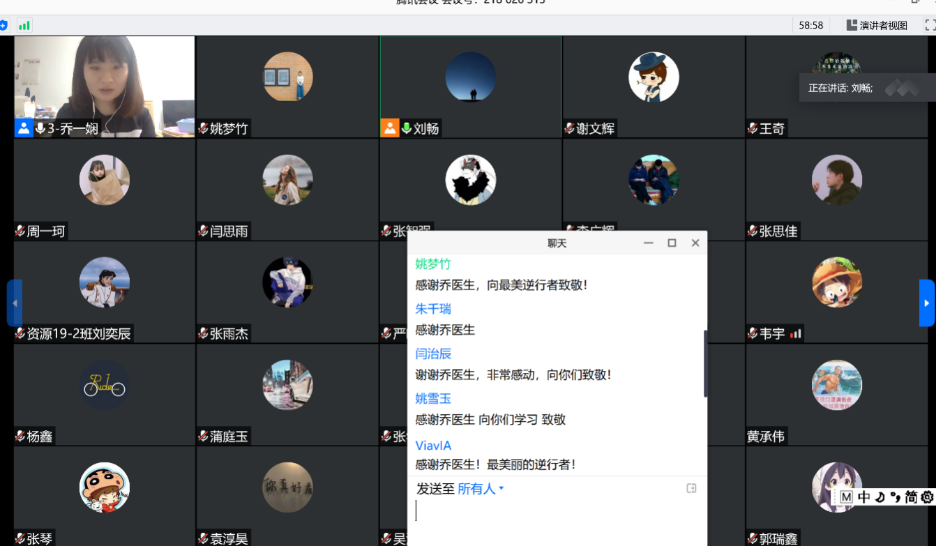 喬一嫻醫生作為國家援鄂醫療隊的一員,在抗擊新冠肺炎疫情的斗爭中,挺身而出、主動擔當、無私奉獻,充分展現了新時代中國青年的精神風貌,展示出有理想、有本領、有擔當的青年力量。喬醫生分別從外部條件的惡劣和援鄂隊員自身防護問題,講述了援鄂醫療隊在沒有硝煙的戰場救死扶傷的事跡,表現了全體援鄂隊員舍生忘我的勇氣,展現了共產黨員沖鋒在前的擔當。最后,喬醫生還提醒全體師生要有健康意識、防控意識,相信科學、相信黨和國家,只要大家萬眾一心,沒有不能戰勝的疫情,沒有不能克服的困難。