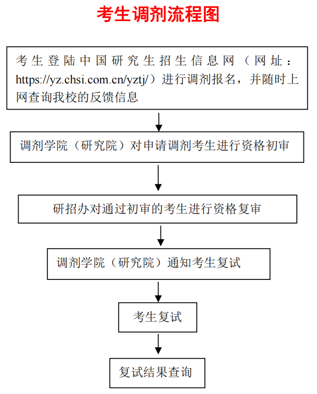 嚴格按照教育部關于印發《2021年全國碩士研究生招生工作管理規定》的通知(教學函〔2020〕8號)“第九章 調劑”部分的相關要求執行。