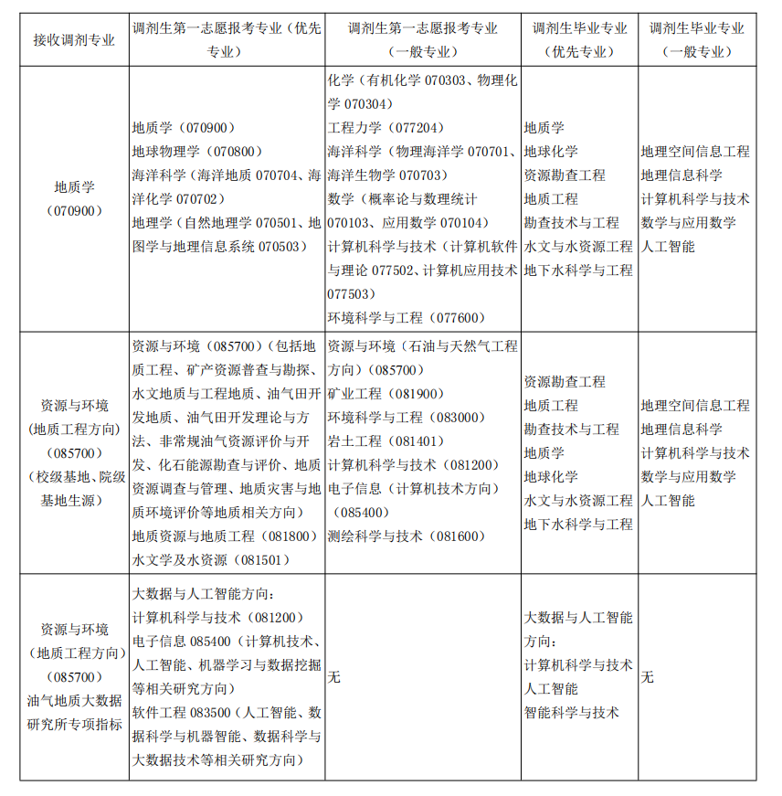 接收調劑的專業包括地質學、全日制資源與環境(地質工程方向),具體缺額、接收調劑的初試考生類型、考試科目要求及初試分數線的要求見表1。