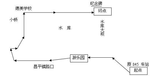 本次長走全程10公里,沿十三陵水庫環(huán)繞一周,途中設(shè)兩個(gè)路標(biāo)領(lǐng)取點(diǎn),請依次領(lǐng)取路標(biāo),按規(guī)定走完全程。走完全程后憑路標(biāo)和長走標(biāo)志領(lǐng)取獎券。