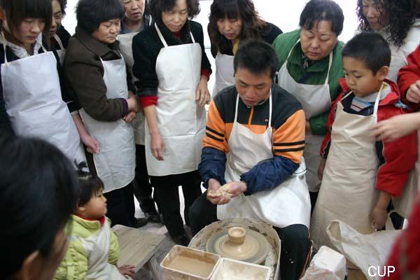 此次活動包括三個(gè)版塊,首先來到放映廳,大家在這里觀看《萬千情節(jié)話瓷器》專題片,學(xué)習(xí)了陶瓷知識,了解中國瓷文化的精湛工藝及悠久歷史,欣賞精美的陶瓷工藝品。之后進(jìn)入彩繪間,大家用五彩的畫筆在白色的毛坯盤上盡情發(fā)揮自己的想象力,任意地涂鴉,描繪出各種各樣的圖案。最后到了拉坯間,在陶藝師傅的指導(dǎo)下,自己親自動手,用拉坯機(jī)制作了一件件雖然不太精致,但卻寄予無限希望的作品。大家親自作了一回“陶瓷藝人”,每個(gè)人的臉上都蕩漾著滿足的笑容。