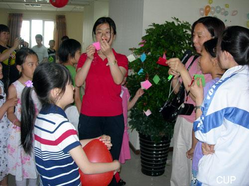 為了培養(yǎng)孩子們互助、友愛和奉獻(xiàn)精神,體會(huì)人世間的關(guān)懷、愛心、溫暖,讓孩子們度過一個(gè)有意義的節(jié)日,本次活動(dòng)特意安排了“祝福災(zāi)區(qū)小朋友們”這一環(huán)節(jié)。孩子們?cè)谙涤屑t絲帶的愛心小卡片上寫滿了祝福的話語,并把愛心卡掛在了“愛心樹”上。孩子們?cè)谛】ㄆ蠈懙溃骸拔抑溃@一刻,心被震碎了,很痛很痛。但是,我們會(huì)讓你再次感受到愛。讓愛沒有殘缺……”;“親愛的朋友,請(qǐng)你鼓起勇氣!!我們?yōu)槟銚纹鹨黄{(lán)天,也請(qǐng)你們珍惜生命,手牽手,我們一起走。共同尋回美麗的家園。明天會(huì)更美好!”;“希望災(zāi)區(qū)的小朋友早日回到自己熟悉的教室!”;“六一兒童節(jié)到來之際,愿災(zāi)區(qū)小朋友拋棄悲傷,點(diǎn)亮希望之燭,祝災(zāi)區(qū)小朋友六一節(jié)快樂!”……只言片語表達(dá)了孩子們對(duì)災(zāi)區(qū)小朋友的牽掛和祝福,我們相信災(zāi)區(qū)的小朋友們一定會(huì)感受得到這份真摯的祝福。