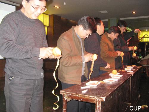 12月26日晚,地下舞廳被高高掛起的紅燈籠和拉花裝扮得分外溫馨,處處洋溢著節(jié)日的氣氛。聯(lián)歡會(huì)氣氛熱烈而又歡快,各工會(huì)小組紛紛表演了精彩的節(jié)目。其中,院辦五朵金花集體創(chuàng)作的贊美學(xué)院的“三句半”令人耳目一新;男教師“削蘋(píng)果競(jìng)賽”以及小游藝“超級(jí)模仿秀”和“心有靈兮”讓人捧腹開(kāi)懷;“新年幸運(yùn)抽獎(jiǎng)”更是懸念迭起。整個(gè)聯(lián)歡會(huì)暖意融融、歌聲笑語(yǔ)不斷,教師們翩翩起舞,充分顯示了資源與信息學(xué)院是一個(gè)充滿(mǎn)活力、凝聚力、和諧的集體。