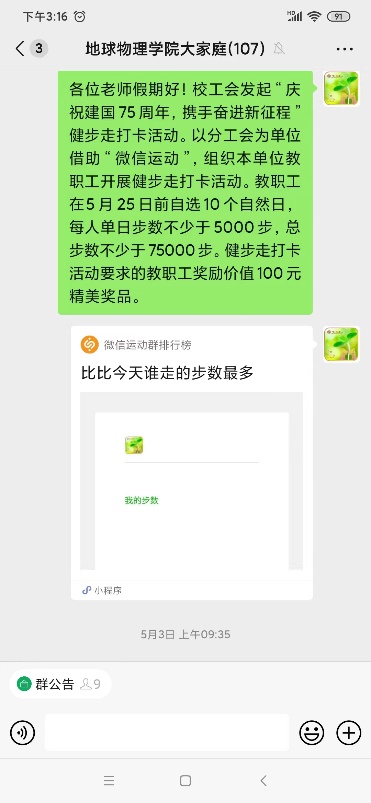 ] 5月3日至5月25日,地球物理學院分工會開展“慶祝建國75周年,攜手奮進新征程”健步走打卡活動,借助“微信運動”小程序,組織本單位教職工開展健步走打卡活動。