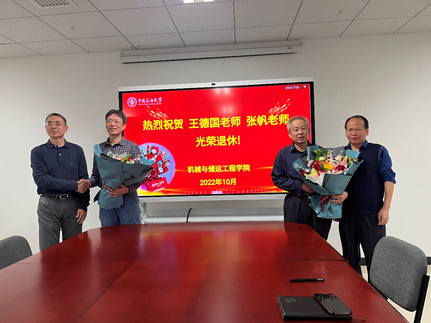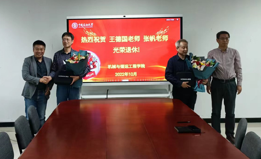 ] 10月14日下午,機械與儲運工程學院在院會議室B921舉辦榮休會,院系領導和部分教師代表齊聚一堂,歡送王德國教授和張帆副教授光榮退休。