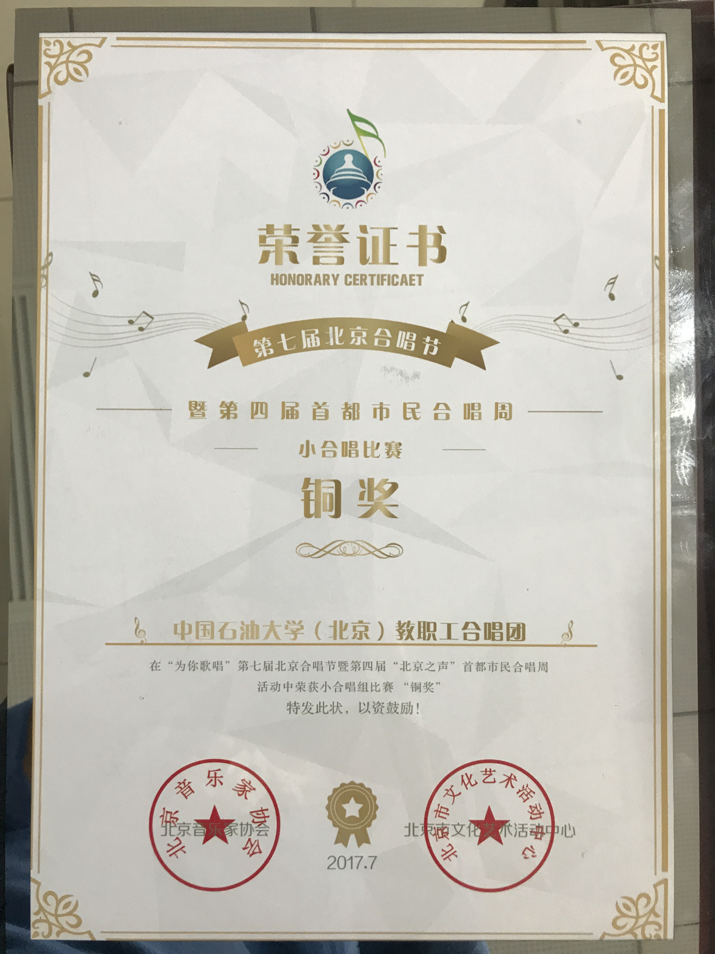 2017年8月25日,為迎接黨的十九大召開,我校教職工合唱團參加了由北京音樂家協會、市教委藝教委等單位共同主辦的“為你歌唱——第七屆北京合唱節暨第四屆首都市民合唱周小合唱組比賽。我校參賽的曲目有【我和我的祖國】和【葡萄園夜曲】,合唱團員不畏酷暑在暑假期間通過大家的共同努力刻苦訓練,比賽取得了優異的成績,獲得了銅獎;本次小合唱組比賽由全市43支合唱團隊同臺競技參與角逐,有許多優秀的合唱團隊,給更多合唱愛好者展示自我的機會。