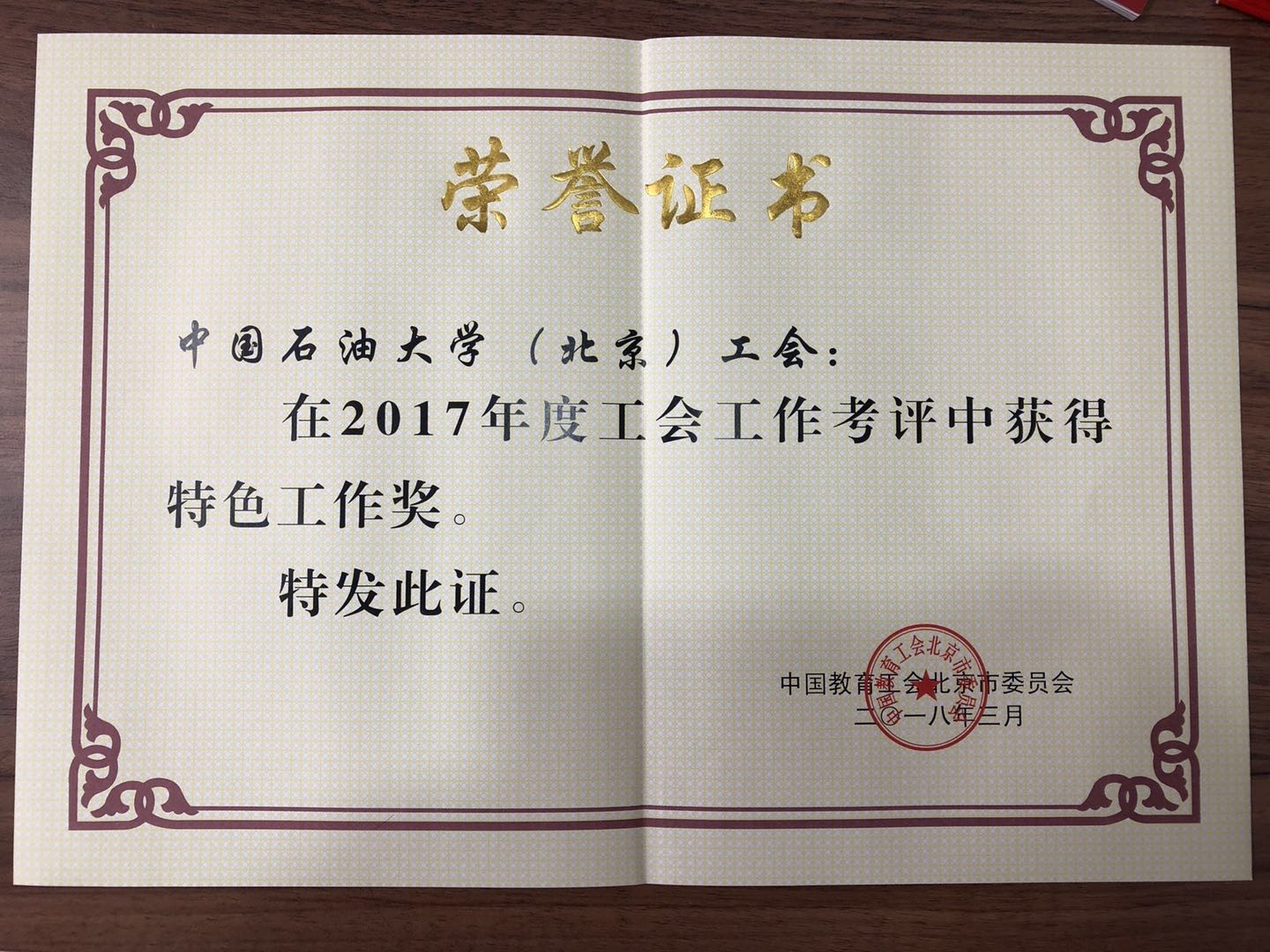 2018年3月13日下午,北京市教育工會(huì)召開(kāi)第十屆委員會(huì)第二次全體(擴(kuò)大)會(huì)議,會(huì)議表彰了2017年度工會(huì)工作中的先進(jìn)集體和特色成果,中國(guó)石油大學(xué)(北京)工會(huì)榮獲2017年度北京市教育工會(huì)“綜合考評(píng)獎(jiǎng)”和“特色工作獎(jiǎng)”。