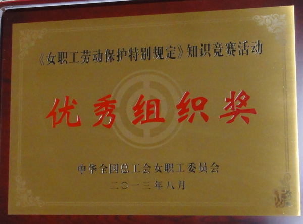 2013年4月28日是《女職工勞動保護特別規定》頒布施行一周年。為進一步推動保障女職工權益法律法規的學習和普及,促進保護女職工權益法律法規的貫徹落實,全總和北京市總工會女職工委員會于4月28日至8月28日在全國和北京市組織開展《女職工勞動保護特別規定》知識競賽活動。為貫徹落實全總和北京市總工會工作要求,中國石油大學(北京)工會女教職工委員會于6月6日至6月26日在全校范圍內開展《女職工勞動保護特別規定》知識競賽活動。日前比賽揭曉,我校工會獲優秀組織獎。