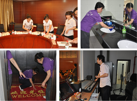 保潔組對中油大廈外圍和室內進行了徹底的清掃和消毒,并更換了電梯地毯,增添了衛生間洗手液及紙巾;會議組整理擺放好各種會議花卉及會議用品等。大會期間,公司增加了中油大廈的服務人員和保潔員,并增加了保潔時間和次數,值得一提的是,為了配合大賽的彩排工作,有的員工加班一直到深夜。