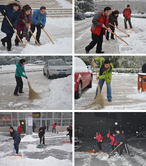 物業(yè)服務(wù)公司凌晨五點(diǎn)組織全體人員開始進(jìn)行清掃工作,八點(diǎn)前將校園南北校區(qū)幾條主干道積雪清掃完畢,并備齊除雪作業(yè)所需的工具提供給志愿者使用。學(xué)生工作處組織各學(xué)院學(xué)生志愿者按各自劃分區(qū)域進(jìn)行掃雪工作,共出動(dòng)學(xué)生志愿者300余人次,圓滿地完成了清掃任務(wù)。校工會(huì)也組織了部分教職工加入到掃雪鏟冰志愿工作當(dāng)中。后勤管理處組織人員對校園掃雪鏟冰工作進(jìn)行了全面協(xié)調(diào)和檢查。