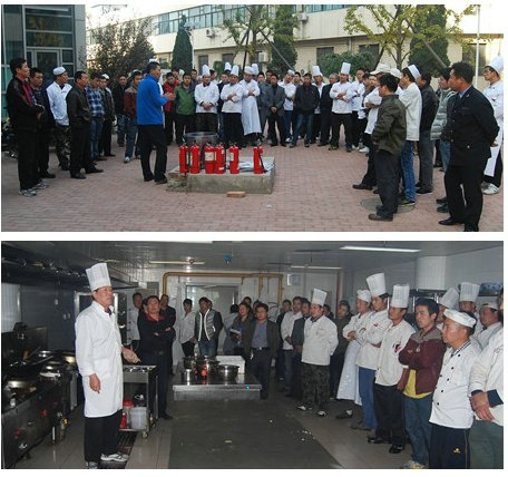 餐飲服務公司經理王德杰就食堂安全消防工作做了重點部署,他指出,食堂消防無小事,員工一定要樹立消防安全意識,熟練掌握各類消防器材的使用方法,了解突發火災事故時如何處理。監督部李德忠現場講述并演示了涼油澆滅和滅火毯覆蓋這兩種處理油鍋著火的辦法。