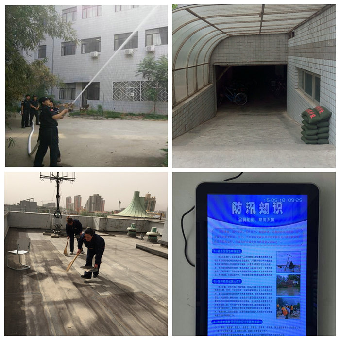 后勤管理處作為學校防汛工作的具體組織和實施單位,以提高汛期學校預防和應對突發災害的能力為重點,對全校防汛重點部位進行了安全隱患排查,建立了《防汛安全隱患臺賬》;成立了防汛應急搶險隊,在校園各重點防汛部位放置沙包、抽水設備、雨具等防汛物資;對《中國石油大學(北京)防汛工作預案》進行了完善修訂。后勤各實體公司均進行了安全隱患自查并制訂了應對各類潛在災害風險的應急預案。動力維修公司、公寓服務公司和潤杰物業公司組織人員對校園建筑物屋頂、雨水口進行了全面清理,協助氣象部門對樓宇避雷設施進行檢測,確保汛期的校園安全。各學生公寓、食堂利用條幅、宣傳海報、LED屏等,向學生宣傳預防地質災害、消防安全等知識。