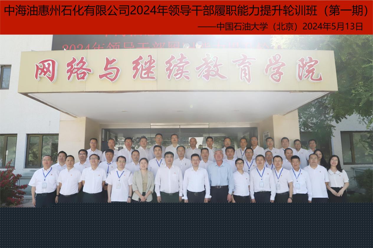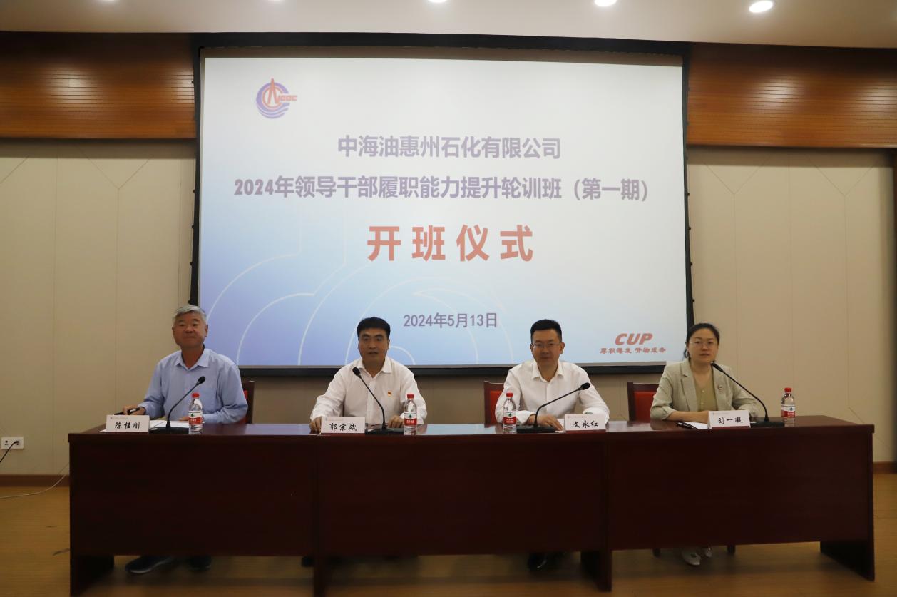 5月13日,中國石油大學(北京)承辦的“中海油惠州石化有限公司2024年領導干部履職能力提升輪訓班(第一期)”順利開班。中海油惠州石化有限公司總經理助理兼煤制氫部經理郭宗斌、中國石油大學(北京)黨委副書記文永紅出席開班式并講話,網絡與繼續教育學院院長陳桂剛主持開班式。