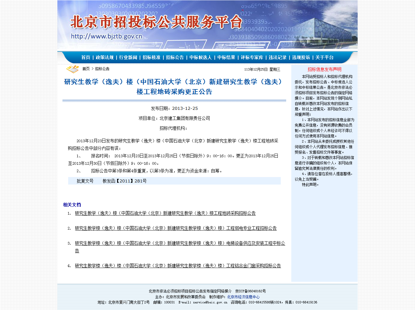 原中石大基建工程2013-27號中國石油大學(xué)(北京)研究生教學(xué)樓(逸夫)樓(中國石油大學(xué)(北京)新建研究生教學(xué)樓(逸夫)樓)地磚采購招標(biāo)公告中部分信息有誤,現(xiàn)更正公告已在北京市招投標(biāo)公共服務(wù)平臺網(wǎng)站公示