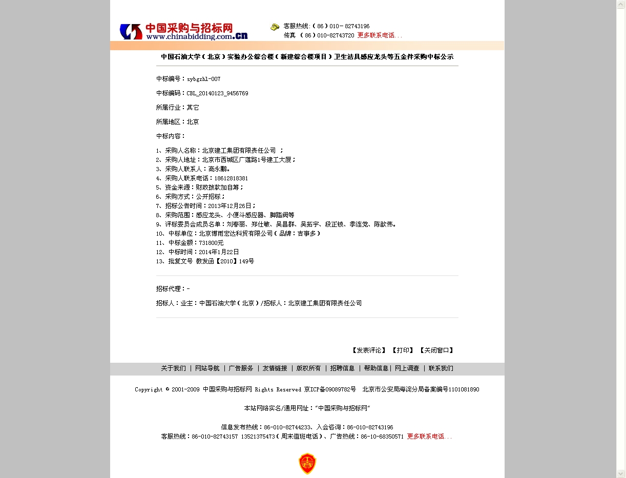 附圖: 中國采購與招標網中國石油大學(北京)實驗辦公綜合樓(新建綜合樓項目)衛生潔具感應龍頭等五金件采購招標結果公示
