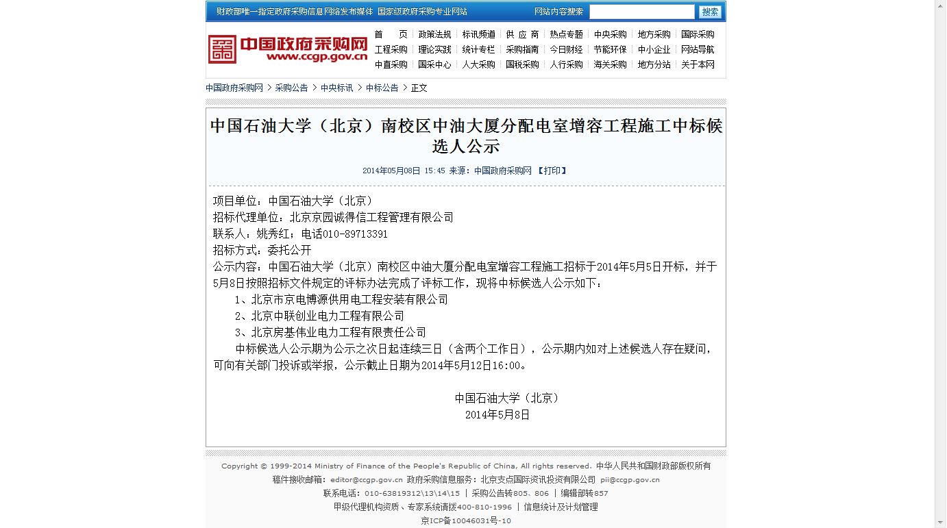 中國(guó)石油大學(xué)(北京)南校區(qū)中油大廈分配電室增容工程施工中標(biāo)候選人已在中國(guó)政府采購(gòu)網(wǎng)公示,您可以通過(guò)以下鏈接查詢公告具體內(nèi)容: