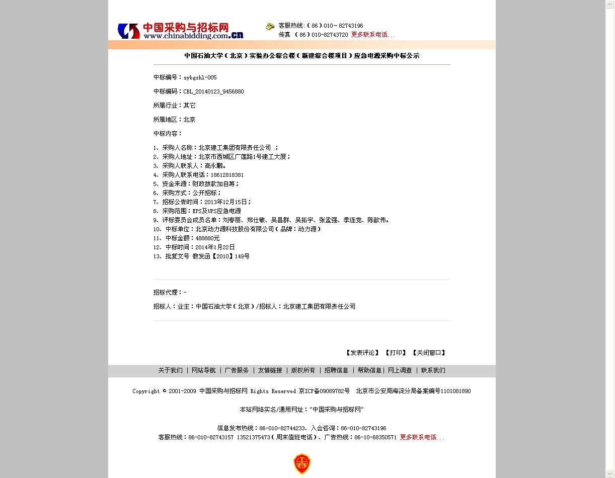 附圖: 中國采購與招標網中國石油大學(北京)實驗辦公綜合樓(新建綜合樓項目)應急電源招標結果公示