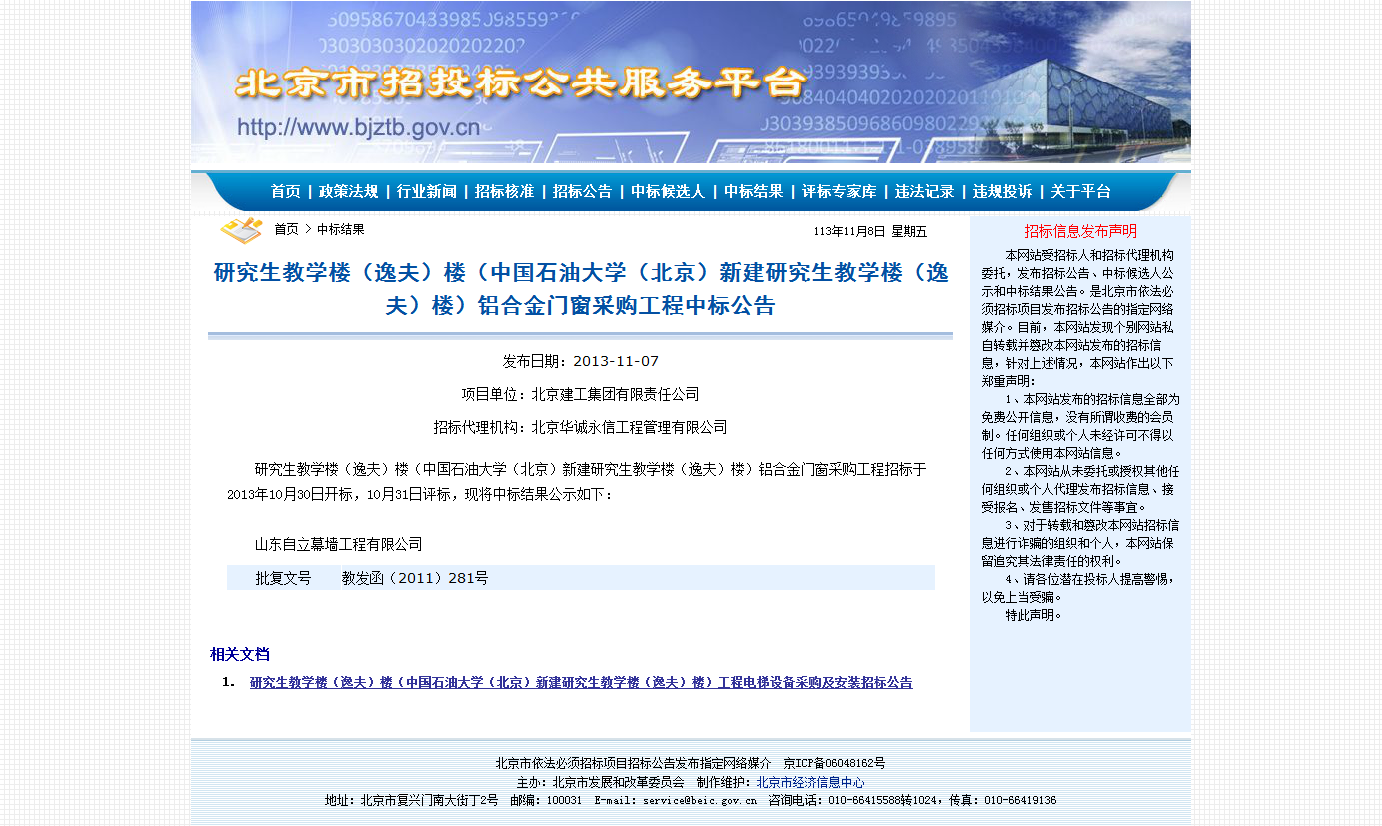 附圖:北京市招投標信息平臺網站研究生教學樓(逸夫)樓工程鋁合金門窗采購中標公告