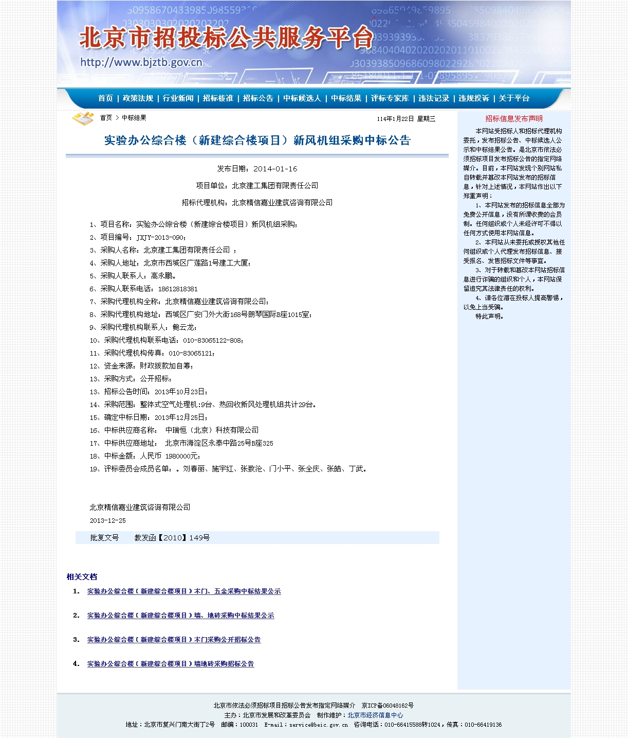 北京市財政局網站實驗辦公綜合樓(新建綜合樓項目)新風機組采購中標公告: