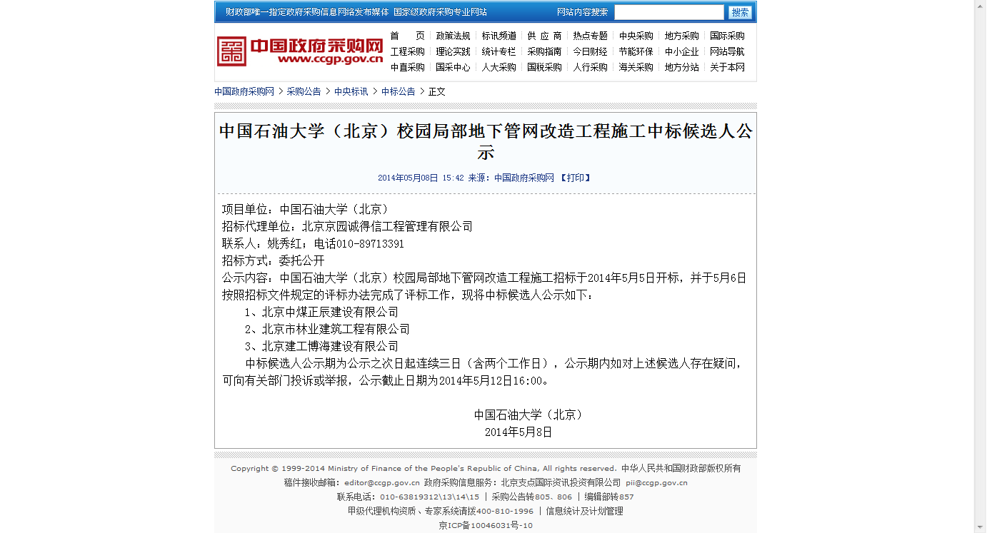 附圖:中國政府采購網(wǎng)中國石油大學(xué)(北京)校園局部地下管網(wǎng)改造工程施工中標(biāo)候選人公示