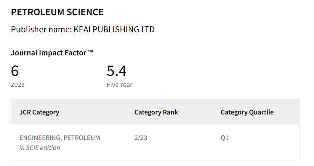 2024年6月20日,Clarivate Analytics發(fā)布了2023年度《期刊引證報(bào)告》(Journal Citation Reports, JCR),Petroleum Science 影響因子(IF)6.0!相比去年上漲7%,在發(fā)文量大幅增加的情況下,影響因子仍然保持了穩(wěn)步增長(zhǎng),位居SCI收錄的23種石油工程類學(xué)術(shù)期刊第2位,位于Q1區(qū);總被引頻次5330次,相比去年上漲24.8%。