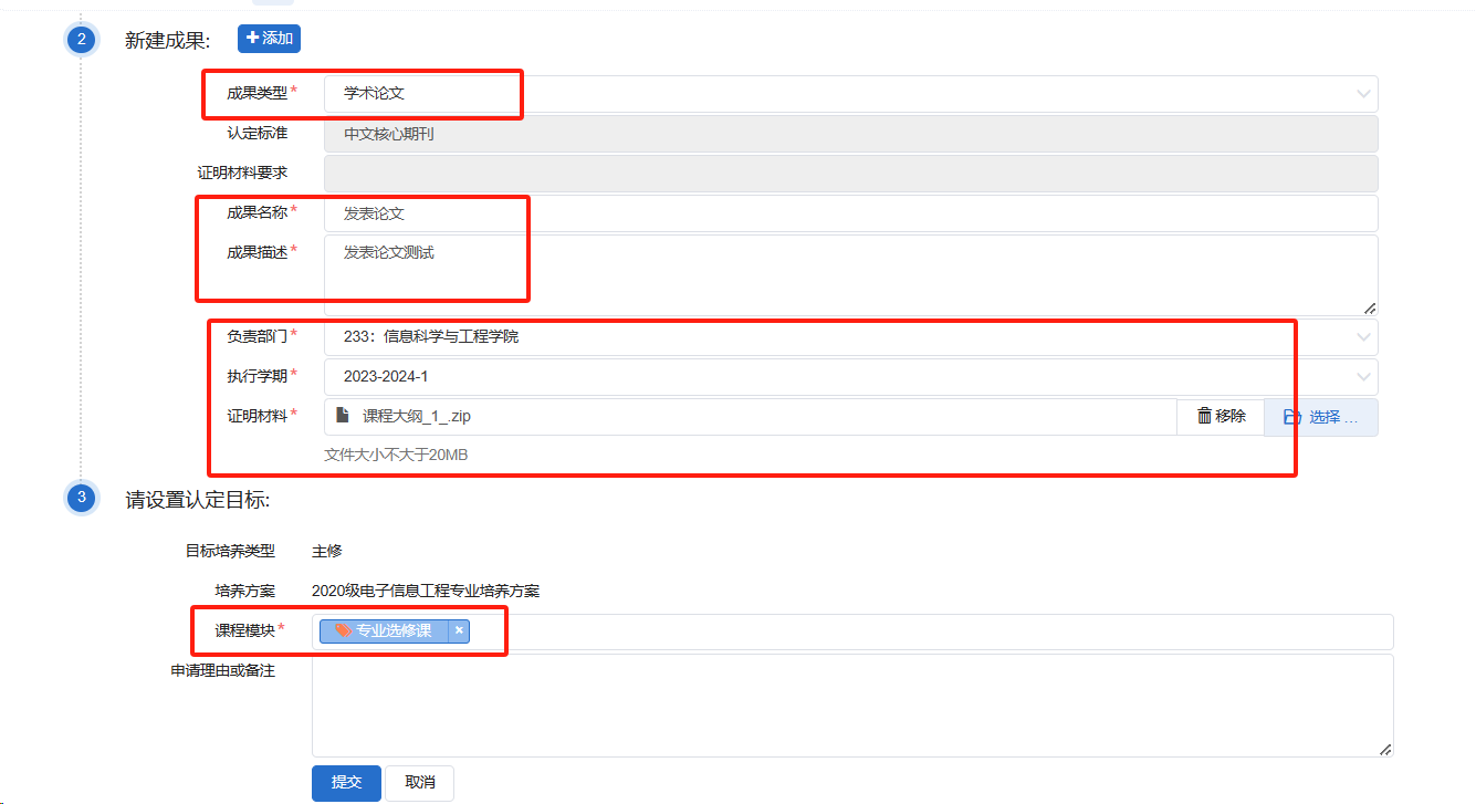2. 進入申請頁面,選擇成果類型,填寫成果名稱、成果描述,上傳《創新創業實踐溢出學分用于替代專業選修課學分匯總》,最后在認定目標里選擇需要認定的培養方案中的專業選修課程模塊點擊“提交”即可。