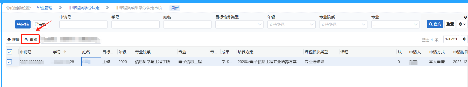 2. 進入功能,顯示待審核學生申請;選中點擊審核按鈕即可進行審核操作。