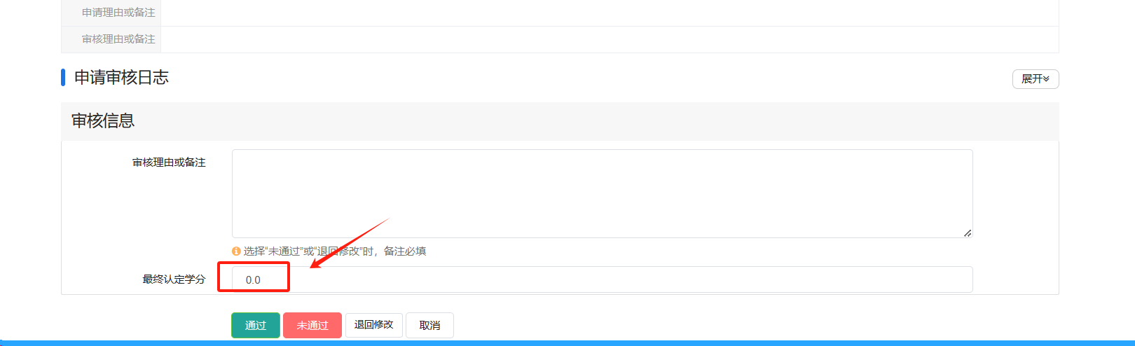 注:審核時,下方的最終認定學分默認為0,需要修改成認定學分后再進行審核。