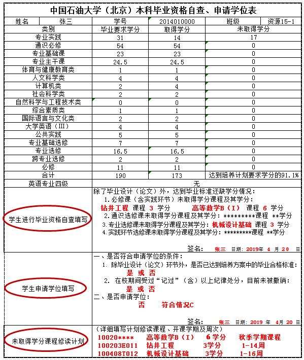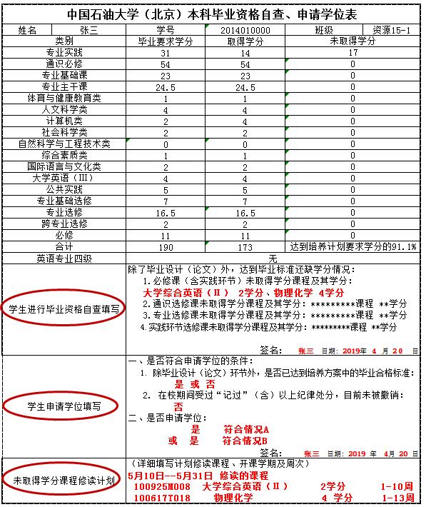 根據所取得學分,將本人符合的學位申請情況填寫在“學生申請學位填寫”欄,打印后本人簽名確認于5月10日前交至學院。申請學位樣表見附件。