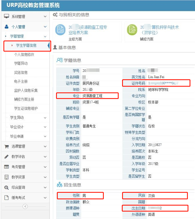 登錄“本科教務管理系統”,個人管理→學籍管理→學生學籍信息,核對本人證件號碼、專業、性別、民族和出生日期,如有問題請直接聯系教務處(010-89739131)。
