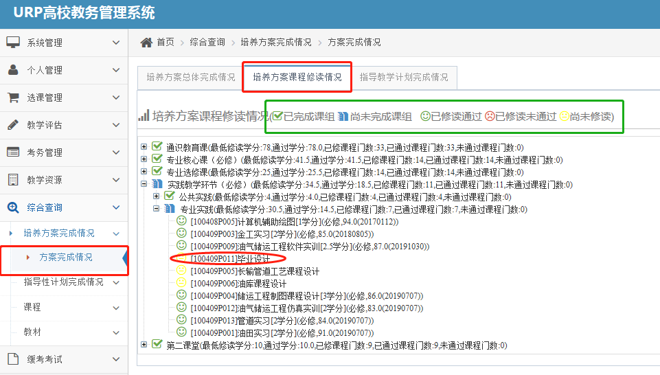 登錄“本科教務管理系統”,“綜合查詢”→“培養方案完成情況”→“培養方案課程修讀情況”,如下圖所示,在“尚未完成的課組”中,核查課程完成情況。當所有課組顯示“已完成課組”時,即表示完成培養方案要求。