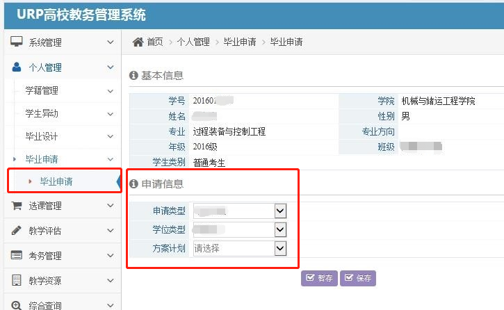 登錄“本科教務管理系統”,“個人管理”→“畢業申請”中,點擊右上角“添加新的申請”,出現如下圖頁面。