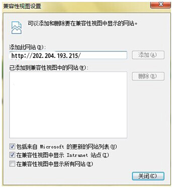 二、如使用IE11以上瀏覽器,請先在瀏覽器“工具”菜單中,找到“兼容性視圖設置”(如下圖)在“添加此網站”中添加網址“http://202.204.193.215/”,確定關閉即可。