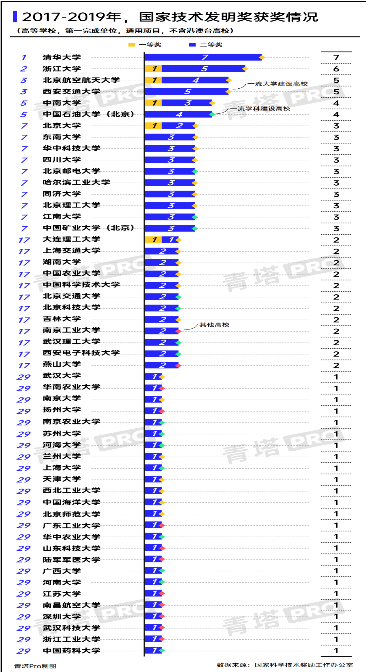 近期,根據(jù)國(guó)家科學(xué)技術(shù)獎(jiǎng)勵(lì)工作辦公室公布數(shù)據(jù),青塔統(tǒng)計(jì)了2017年-2019年高等院校(不含港澳臺(tái)地區(qū))榮獲國(guó)家科學(xué)技術(shù)獎(jiǎng)的獲獎(jiǎng)情況,并對(duì)數(shù)據(jù)進(jìn)行了梳理和分析。中國(guó)石油大學(xué)(北京)作為第一完成單位,以三年間斬獲4項(xiàng)國(guó)家技術(shù)發(fā)明獎(jiǎng)的好成績(jī),在國(guó)家技術(shù)發(fā)明獎(jiǎng)單項(xiàng)榜單中,并列全國(guó)高校第五位,在全國(guó)一流學(xué)科建設(shè)高校中,排名第一位。