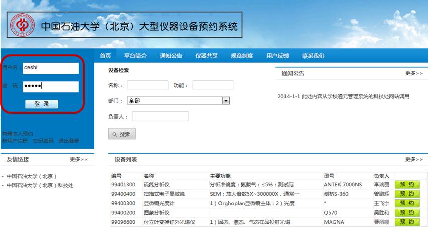 用戶使用瀏覽器登陸http://202.204.201.111,即可進入我校大型儀器設備網上預約平臺,在網站左上方輸入與我校科研管理系統相同的用戶名和密碼,點擊“登錄”,如下圖所示: