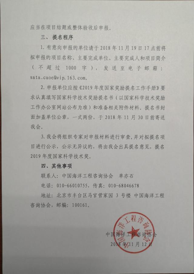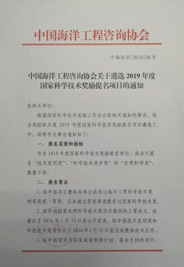 有意參與中國海洋工程咨詢協會2019年度國家科學技術獎勵提名項目遴選的項目負責人,請聯系科學技術處。