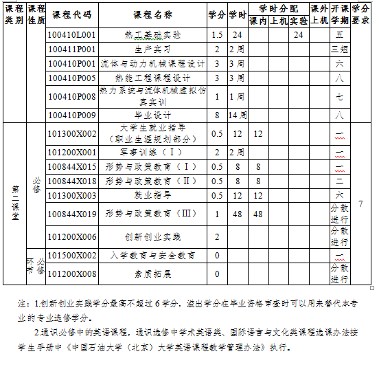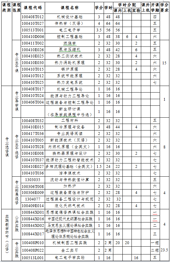 機械制圖、理論力學、材料力學、機械設計基礎、電工電子學、工程熱力學、流體力學、傳熱學、燃燒學、控制工程基礎、泵與壓縮機、熱力渦輪機原理、鍋爐原理、熱工測試技術、熱力發電系統、系統節能原理。