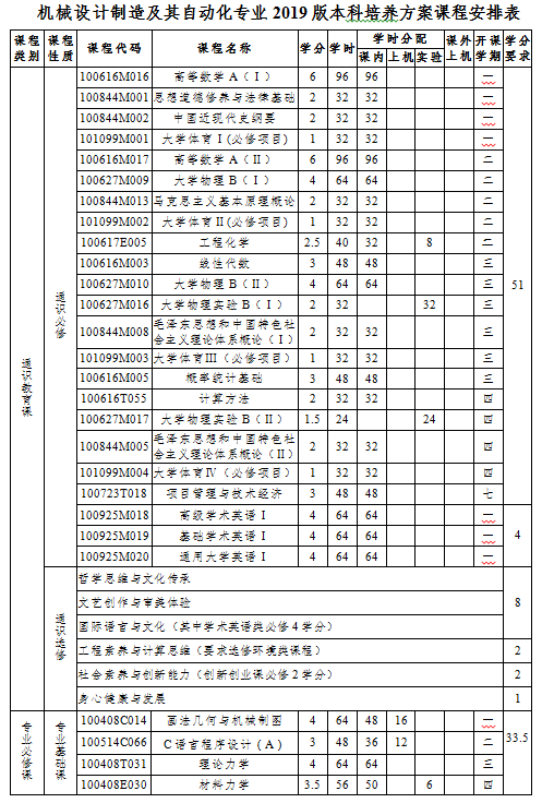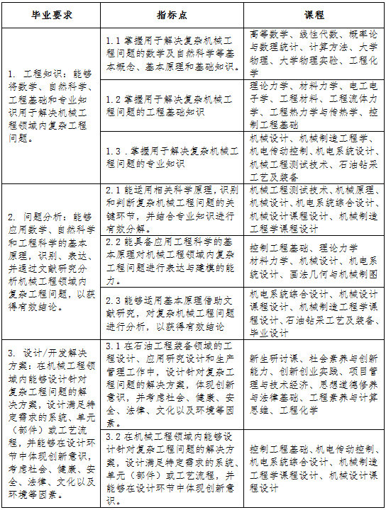 畫法幾何與機械制圖、C語言程序設計、理論力學、材料力學、工程化學、工程流體力學,工程熱力學與傳熱學、電工電子學、機械原理、機械設計、機械制造工程學、工程材料、控制工程基礎、機械工程測試技術、機電傳動控制、機電系統設計、單片機原理及應用、石油鉆采工藝及裝備等。