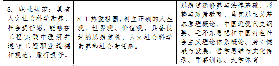 8. 具有人文社會科學素養、社會責任感,能夠在工程實踐中理解并遵守工程職業道德和規范,履行責任。